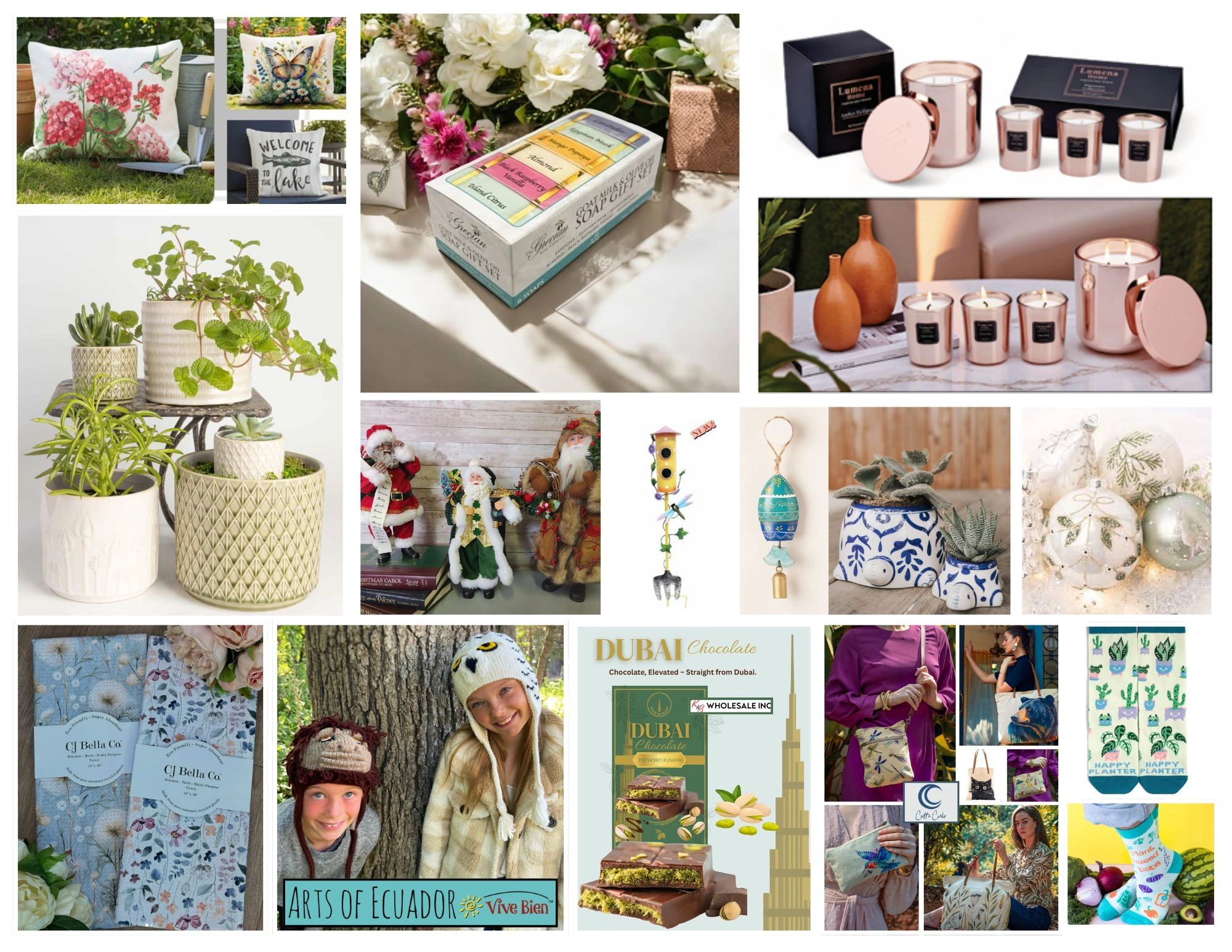 Fabric Santa figures, nutcrackers, snowmen, angels & tree toppers, snow globes, holiday plush and musical items. Halloween, Collegiate, Christmas and Garden Accessory products.